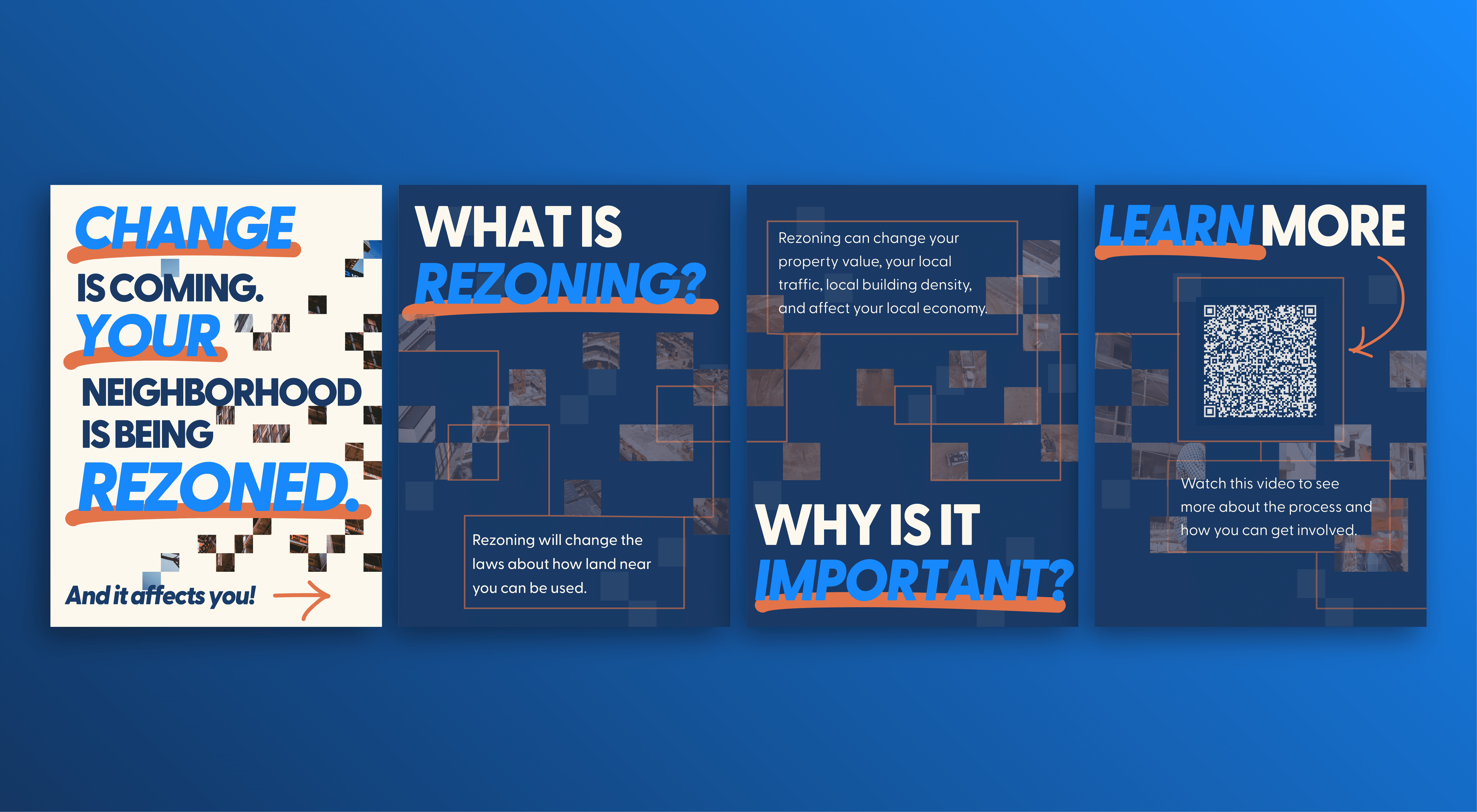 For neighborhoods that lack the space, funding, or other resources for animated posters, we created a static series that introduced why the rezoning process is important and how it affects community members. Relating content back to the viewer was the most successful pathway we found to getting residents to interact with the static posters. The QR code links back to touchpoint A for community members to save or watch on-the-go.