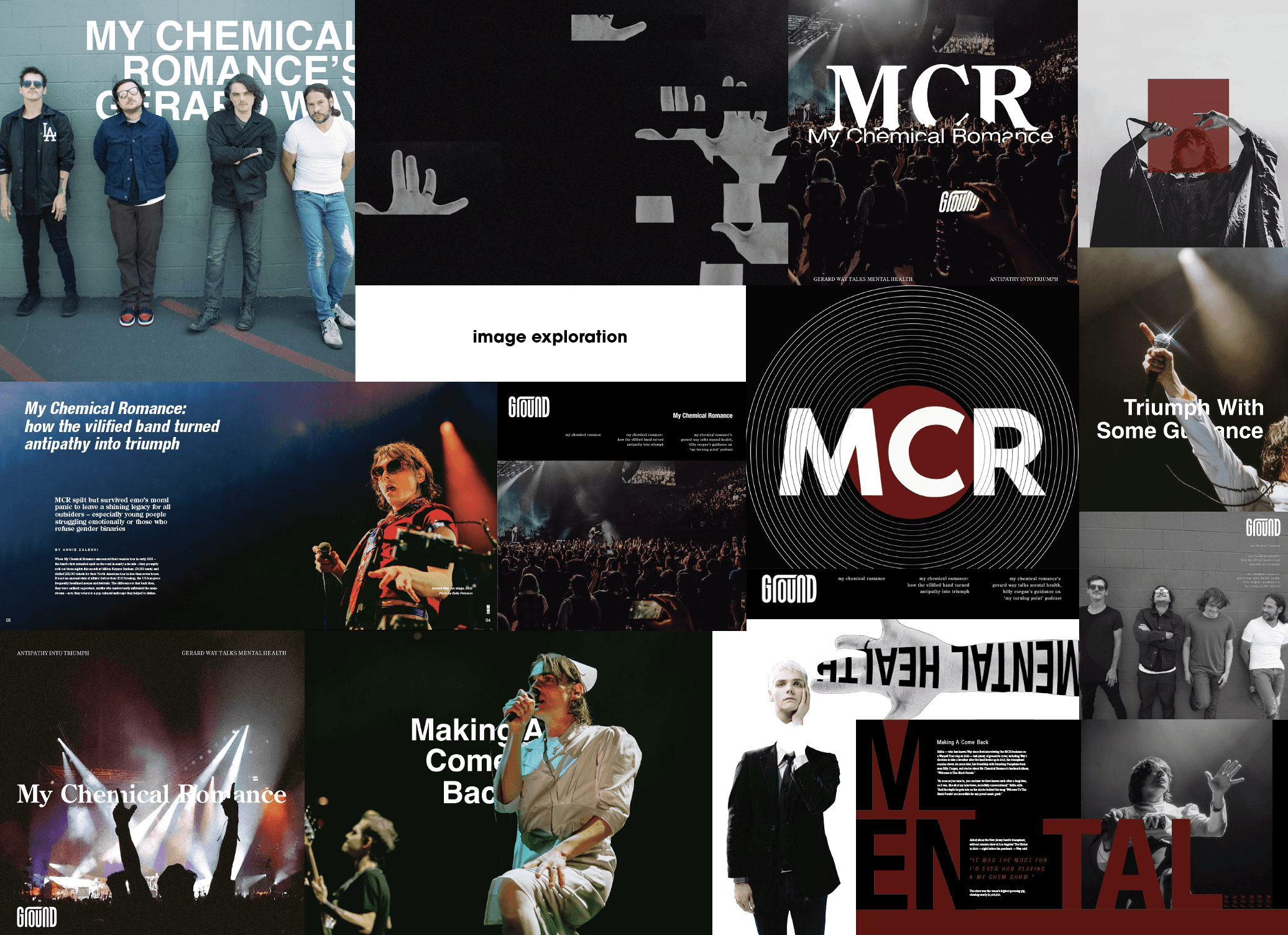 The treatment of imagery needed to by interesting while still being replicable for each band's issue. Below is a glimpse into the extensive exploration of how type and image might interact in the brand.