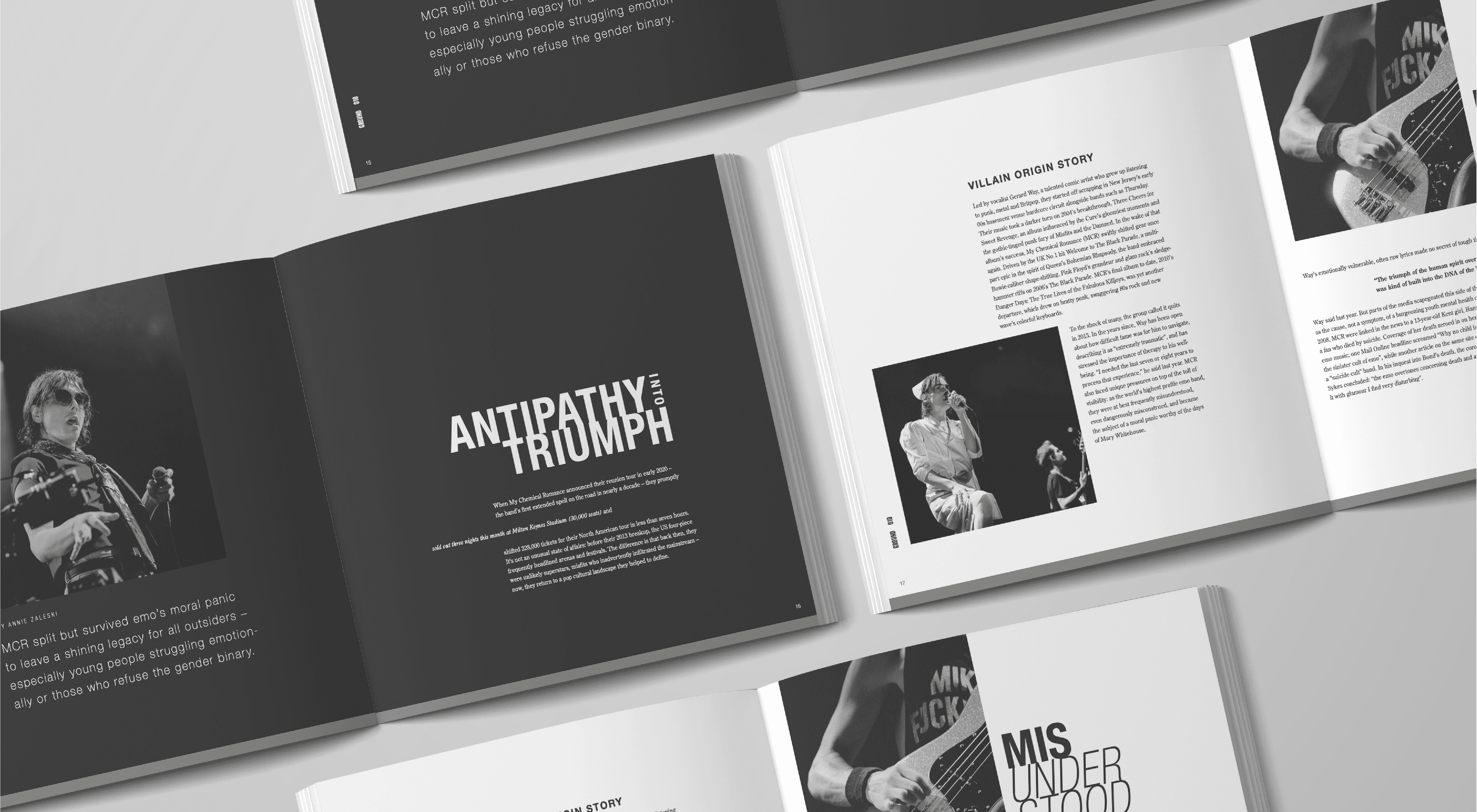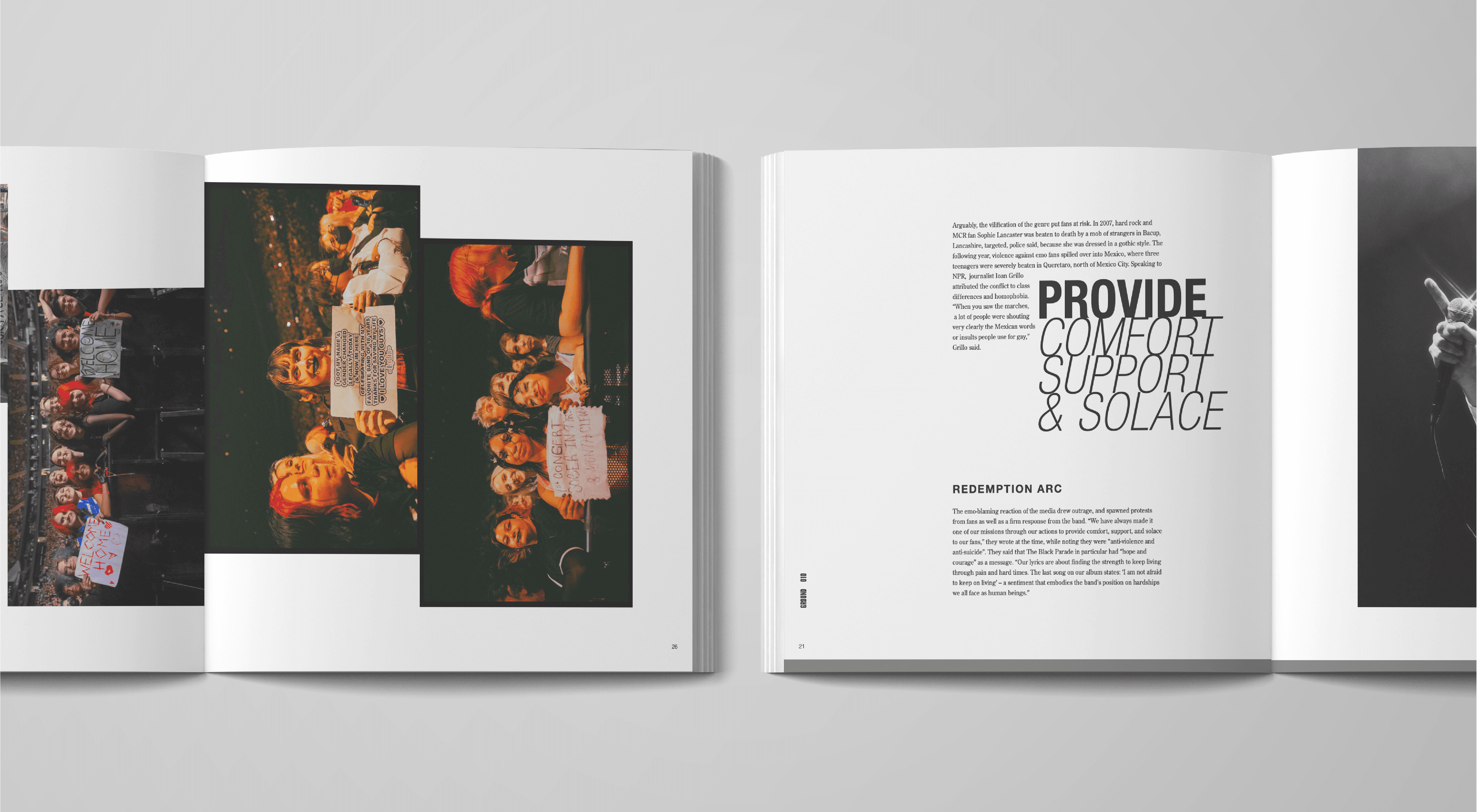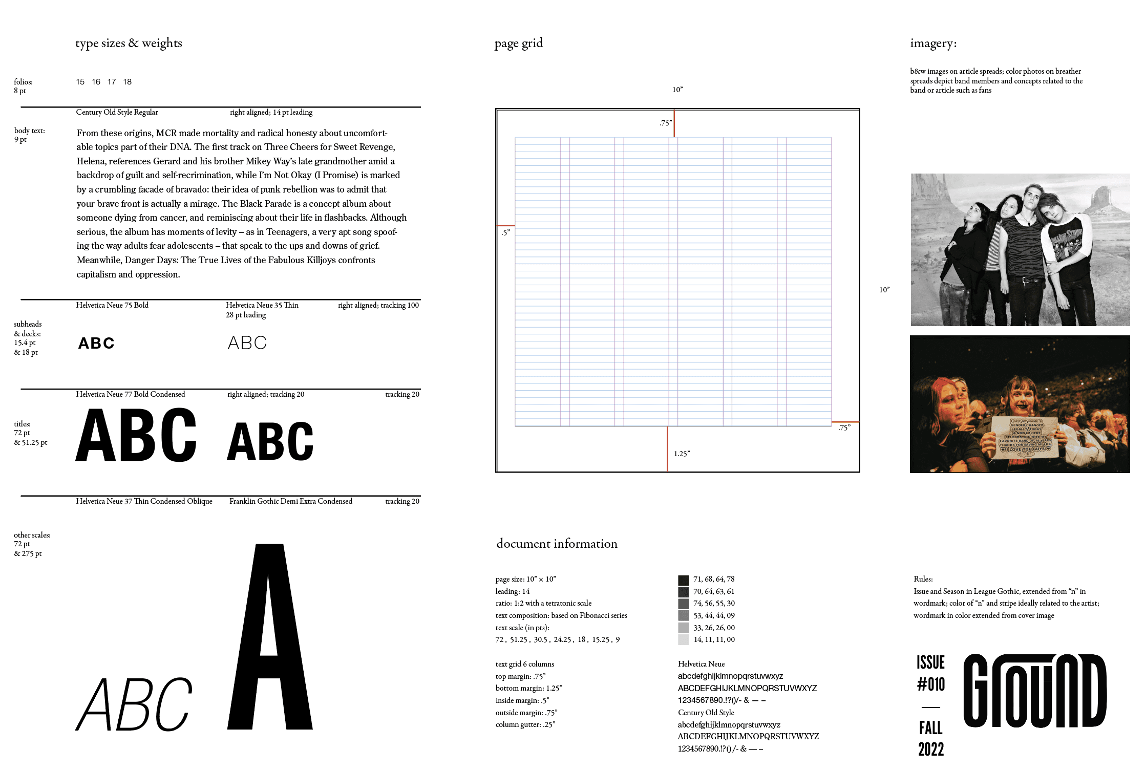 Creating an interesting application of the grid that draws the reader's eye through the pages with curiosity was my biggest hurdle. I did not want it to feel too traditional, but I wanted a clean, adaptable look that could fit several genres of music and personalities of artists.